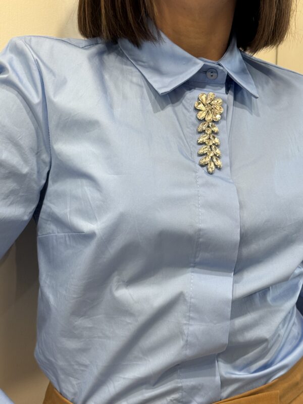 Camicia con colletto classico, chiusura e bottoni nascosti con dettaglio gioiello e polsini alti. Elegante, classica e bon ton.